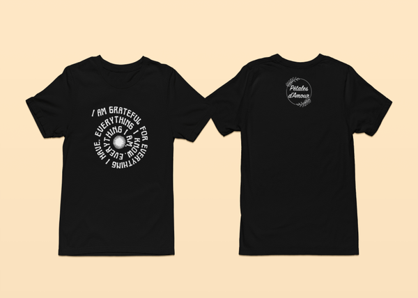 Gratitude in motion. This unique spiral design reads: “I am grateful for everything I have, everything I know, everything I am,” ending in a sunburst. A grounding, reflective piece to wear with pride.